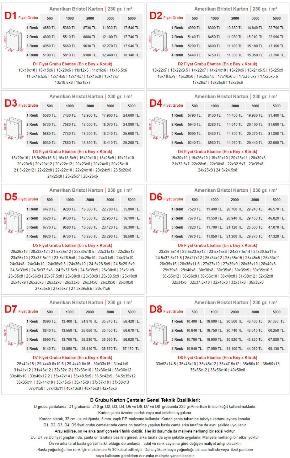 FİYAT TABLOLARI > KARTON POŞET FİYATLARI