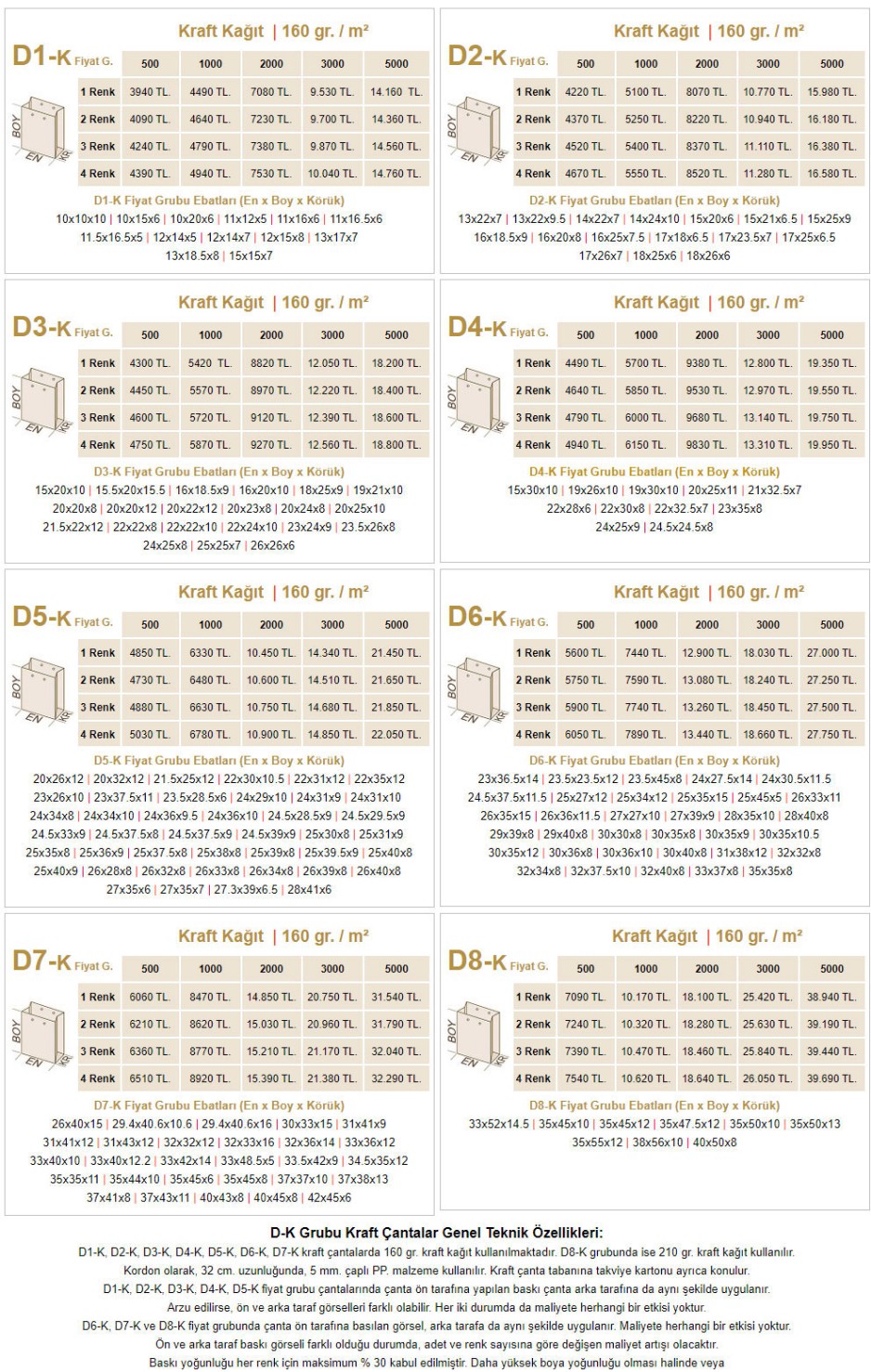 DİK KRAFT POŞET FİYAT TABLOLARI
